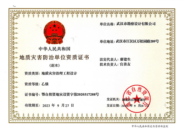 2020年9月28日,公司地質災害危險性評估、勘查、設計丙級升乙級資質申報材料順利通過湖北省自然資源廳審核,并取得了地質災害危險性評估、地質災害治理工程勘查、地質災害治理工程設計乙級資質證書,為公司今后能夠順利承接各類中小型地質災害危險性評估、勘查、設計業務等提供了更有力的保障。