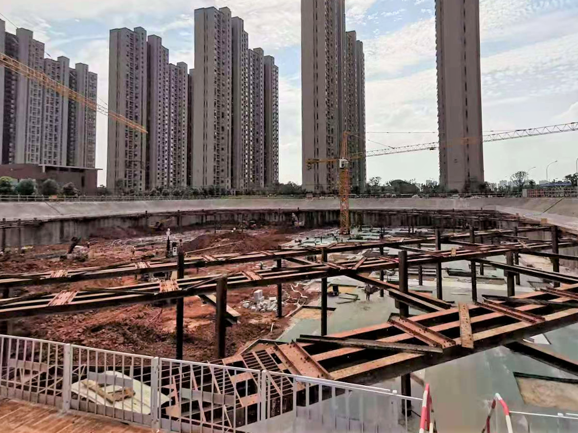 該項目位于武漢市洪山區(qū)青菱新區(qū),地下設(shè)兩層地下室,基坑開挖面積14600㎡,基坑周長476m,基坑開挖深度9.8m—13.6m。在項目方案設(shè)計階段,設(shè)計中心技術(shù)團隊經(jīng)充分討論后決定大膽創(chuàng)新,采用型鋼組合支撐的綠色新工藝,該工藝是武漢市兩層地下室基坑工程中的首次成功應(yīng)用。
